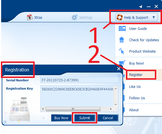 4. Kemudian klik menu Help & support => Register kemudian akan muncul jendela registrasi, silahkan anda isi form Serial Number dan Registration Key dengan code yang sudah ada di dalam file yang anda download tadi lalu akhiri dengan mengklik Submit. Untuk lebih jelasnya silahkan anda lihat gambar dibawah ini.